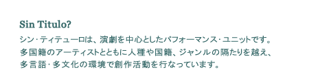 「Sin Titulo」とは、スペイン語で「無題」や「無肩書き」を意味します。人種、国籍、言語、ジャンルなどの枠組みを超えたパフォーマンス創作を目指して、2004年に田室寿見子によって設立されました。東京に住む外国人アーティストと共同で創作活動を行なってきましたが、2008年より日系南米人が多く住む岐阜県可児市において、日本人住民と外国人の交流、相互理解を目指した演劇事業「多文化共生プロジェクト」を製作、以後、毎年継続しています。芸術文化による多文化共生の促進を目指し、ワークショップや公演製作、調査・研究もカバーするなど、その活動は移民との共生の道を模索する海外諸都市からも注目されています。 Sin Titulo Blog はこちら >>